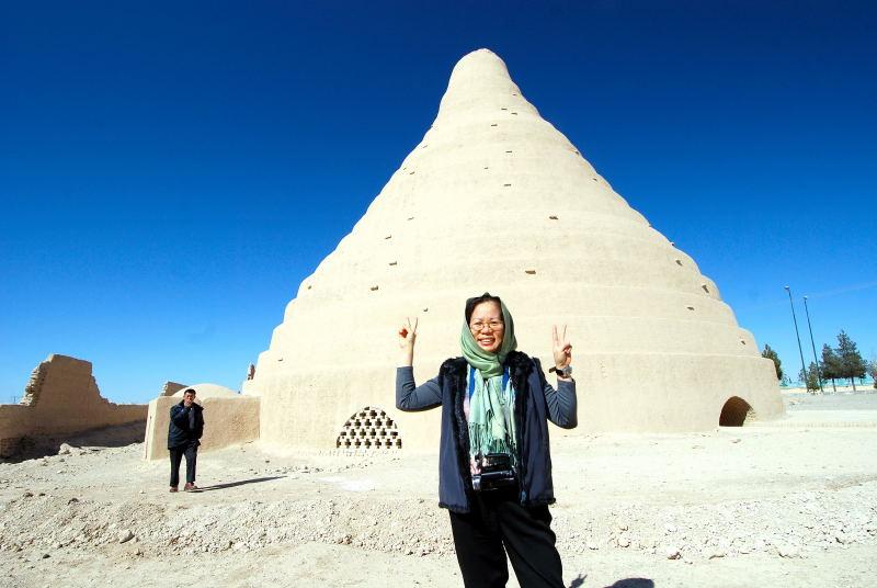 阿巴庫除了有神木以外..在神木的旁邊還有一個超大冰塔(1150)..使用磚塊堆疊方式.宛如一件超大藝術品.冰塔高出地表超過20公尺.非常壯觀..自從家用電冰箱被推廣以後.在伊朗的古董式冰塔大多已經廢棄不用了.. 阿巴庫這個冰塔是經過整修.潔白如新.是當做教學與觀光用途..內部也沒有看到一甕一甕的醃製品..當我們進入冰塔內部(1158).立刻感受冷冷的涼意..整個冰塔的直徑超過20公尺..冰塔內部(1158)是橄欖形狀.深入地底10公尺以上.有土梯連結到最底部..斗笠型大圓頂(1163)..美呆了.