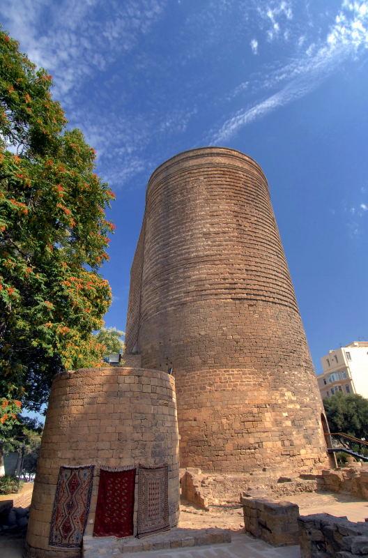 少女塔(Maiden Tower巴庫語Qiz Qalasi)-奠基於瑣羅亞斯德時期的薩珊尼王朝,12世紀建造完成,塔高29公尺的少女塔是旅遊雜誌與當地居民都認同的巴庫地標,這座少女塔本來是建造在裡海的海岸邊,是希凡沙汗王宮殿建築群的一部分。1304年發生超大地震,許多民宅都被夷為平地,然而此塔卻安然無恙。建塔時裡海的波濤就在塔腳下拍打地基.. 20世紀後. 因為人口快速移入後. 土地不夠使用. 因此填積裡海造地. 形成目前廣大面積的海埔新生地,現在這座少女塔的基座位置,已經離海邊幾百公尺遠了,眼前已經在一條車水馬龍的大道上了。塔外形為圓柱狀,東部原形突出部分. 原本是深入在裡海的海水裡面.. 整座少女塔建築體. 共設有8層結構.. 塔基牆厚25公尺,塔頂部厚4公尺,全由石灰石砌成,砌墻的石頭一圈外凸,一圈內凹,在墻上構成一層層清楚的橫線(照片7058有特寫圖)。塔內可以容納200名戰士,內部還有設計取水井. 方便長期防禦時使用。