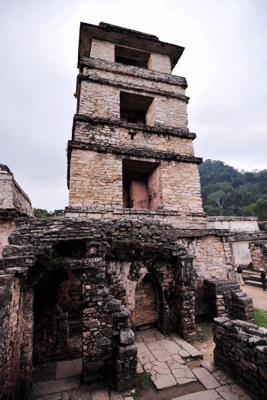 王宮建築群(The Palace)規模龐大. 長 100 米、寬 80 米.. 是由13個具有地窖的房子、3個地下畫廊和一個高塔組成的宮殿.. 五層方形高塔佇立於宮殿的正中心,在馬雅遺跡中未有類似的建築. 比較多人的看法是. 此高塔應該為祭司和貴族們用來觀賞天象之處.. 王宮下面有幾間密室.. 中間的廣場則放置了一些瑪雅文字石雕. 這些石雕群. 僅僅是後人從附近的遺址雕件中搬過來拼觀光用途。