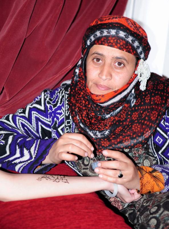 我們因為對葉門手繪不是很懂, 所以並没有太多想法, 任由倆位手繪師在手背上自由創作,作畫的工具只是一層薄薄的塑料紙裹著一種叫-哈那-的材料。 葉門手繪師一邊作畫,一邊不忘告訴我們,在接下來的一個小時裡需要-不動也不洗水的等待顏料晾乾,待多餘的顏料乾燥脫落後,留在人體上的黑色(帶咖啡色)花紋圖案便清晰地顯露出來。“這圖案可以在皮膚上保留兩個星期.. 當然, 這其間你不要洗手洗得太勤快, 洗澡時清潔劑也要避開圖案”...等等的提醒, 無非是想讓我們圖案維持久一點, 看能不能美回台灣吧!