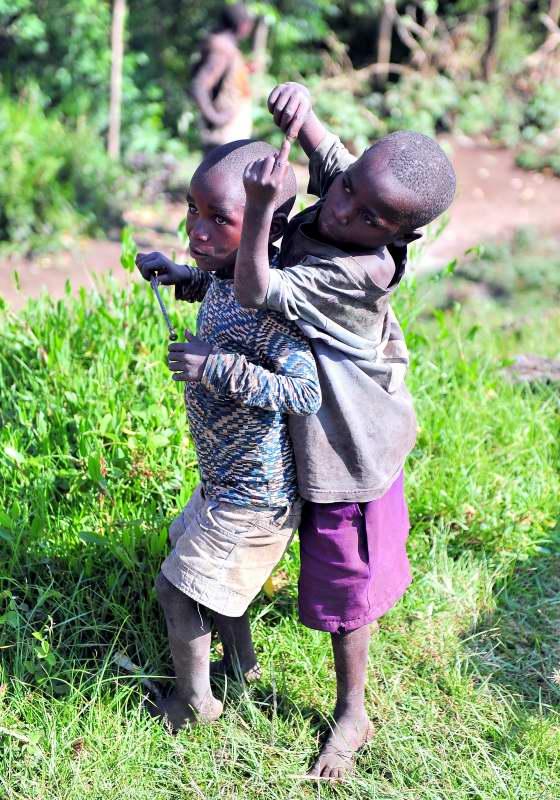 照片導覽.. 140~144只是典型的烏干達農家. 外表看起來像泥磚屋. 其實是木材屋. 外面塗抹泥土可以抗風抗雨抗寒.. 鐵皮屋頂是比較新穎的施工材料.. 幾乎所有的農家都會養殖山羊當家庭副業.. 145~145前往俾格米人(特瓦族)的特定火山區路途. 許多野生狒狒走在公路上. 因為沒有天敵. 所以狒狒的數量很多.. 148非常偏避的鄉間也被張貼了總統候選人傳單.. 150~153 烏干達鄉間路上的人們. 不是撿拾樹枝就是賣命的馱水. 至於小朋友們總是喜歡聚集嬉戲.. 154這間房屋有小耳朵裝置. 是非常富裕的家庭.. 155 這兩位小兄弟其實是在賣甘蔗. 沿街叫賣。