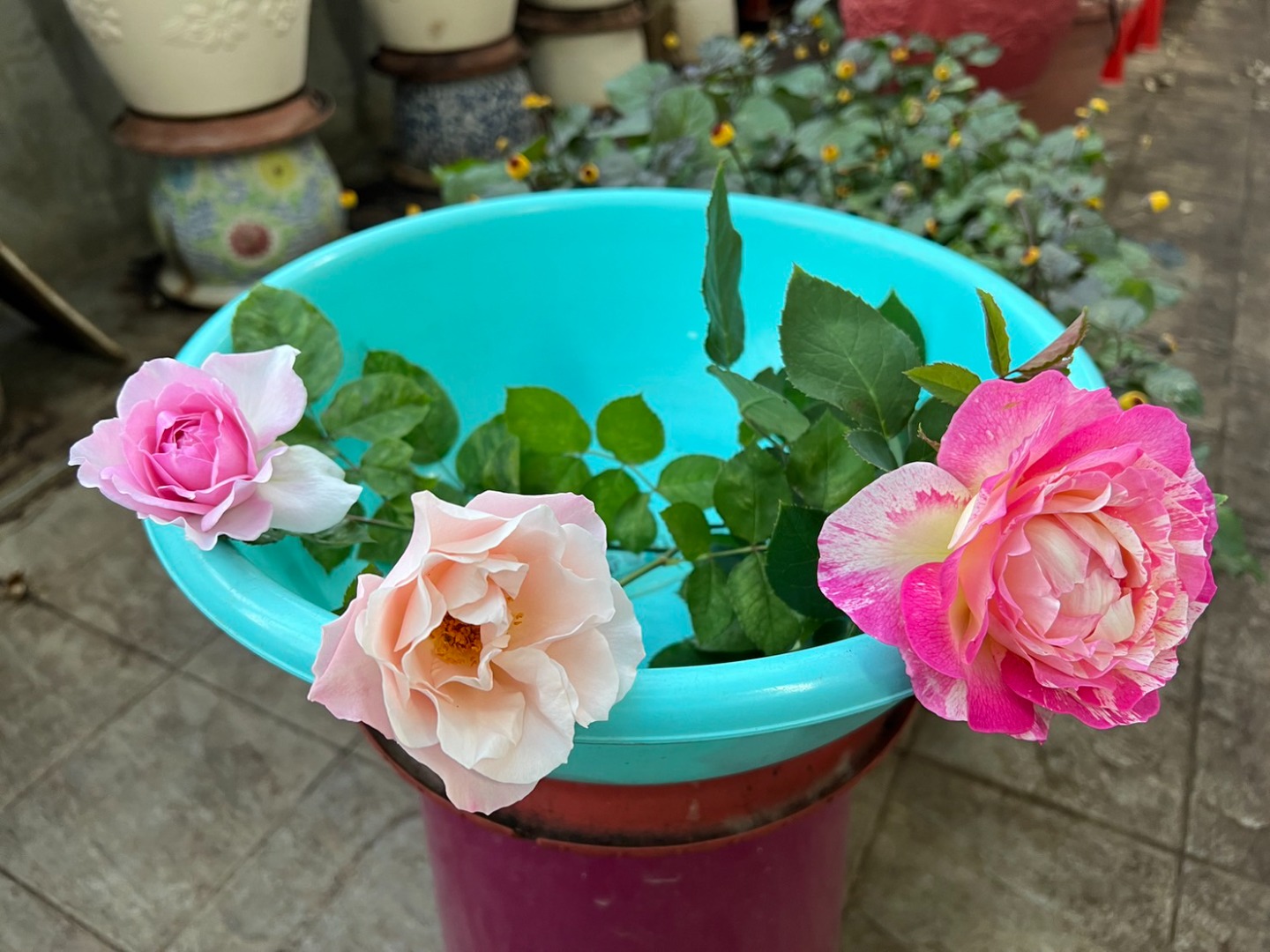 朋友們 早安!連續幾天都是晴朗的好天氣,因為輻射冷卻效應,因此早晚溫差變化很大,穿著還是要求保暖優先,以免感冒!分享昨天傍晚的插花材料,特寫鏡頭依序是:馬克夏加爾,達芙妮,尤麗蒂茜!馬克夏加爾:2014年法國 戴爾巴德 育出,因為比 莫內 晚一年推出,因此被稱為:莫內的妹妹花。此花除了花勁與觀賞性遠大於莫內,其他各項評比都不如莫內。馬克夏加爾 名字來自 俄羅斯 超現實主義派畫家,他的作品中玫瑰花經常會是很重要的元素!達芙妮:新同學,羅莎歐麗 天堂系列,日本 木村卓功 育出,鮭魚色,中輪,中香,花瓣很厚有波浪造型,因此耐開一周以上,也比較耐曬耐雨淋,中灌木,抗病中上。尤麗蒂茜:2016年 木村卓功 育出,屬於羅莎歐麗 浪漫系列 ,中輪,強香,花期4-7天,小灌木,抗病能力中上。以上純粹參考就好,謝謝!祝福 工作順心愉快!